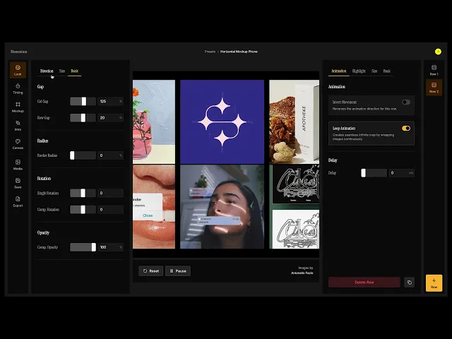 Change timing, spacing, aspect ratio, content, and direction from simple controls.